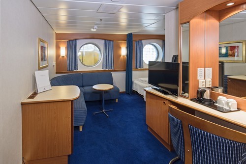 These exclusive suites on the upper deck have one or two rooms, a seating area, TV, kettle, tea/coffee, stereo, internet access and minibar. Some of suites also have a bathtub. Most of the suites have bay windows and a few have private balconies.