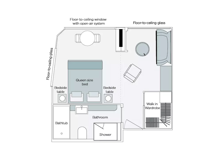 Emerald Grand Balcony Suite Category: S Size: 210 sqft   Each of our Grand Balcony Suites boasts a number of fantastic inclusions, such as an in-suite Nespresso machine – an added home comfort that means that you can relax with a hot beverage at any time, day or night. You’ll also have the option to order a delicious continental breakfast to enjoy on the balcony. And for the perfect start and finish to your evening meal, you can enjoy pre-dinner canapés and after dinner sweet treats courtesy of your exclusive room service, which is included in the price of your suite.    Included in your suite: Outdoor private balcony with open-air system | Bathroom with shower, indulgent toiletries, hair dryer, bathrobes and slippers | In-suite mini-bar available at own expense | Complimentary bottled water, restocked daily | Complimentary Nespresso machine | Complimentary WiFi | Queen-size hotel-style bed |  Pillow menu | Telephone | Safe for your valuables | Individual climate control | Flat screen TV and infotainment system | Continental breakfast, pre-dinner canapés and after-dinner sweet treats served in your suite | Two items of laundry a day | Invite to dinner at the Captain’s Table
